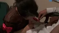 As the camera pans across the room, a young Asian woman stands at the center of the frame.Her smooth, dark skin shimmers in the light as she turns her back to the viewer and bends over, showing off her red and white striped stockings.The camera zooms in on her ass, filling the screen with the sight of her firm glutes and a hint of black lace peeking out from beneath the red material.The admirer steps forward, eagerly taking in her body from every angle.He reaches out to touch her hair, pulling it back from her face so that he can gaze up at her delicious curves.She moans softly as his hands cup and massage her hips, slowly pushing her onto all fours.He positions himself behind her, and begins to slide into her from behind, pounding away with fervor.She cries out in pleasure as their bodies collide, the passionate rhythm echoing through the room.It's a scene that leaves no doubt about the true nature of human desire and the fact that sometimes, all it takes is the right pair of stockings to ignite it.As he delves deeper into her, she clutches onto her bedsheets while her nylon garters gently sway against the rhythm of his thrusts.As their connection becomes more intense, she wraps her mouth around his throbbing cock, her talented tongue working magic on him.The sound of her gagging on his tool fills the room with erotic energy, further driving their passion for one another.Her blowjob skills push him closer to the edge as he relentlessly pounds away at her from behind.Her ass is a vision in its red nylon stockings and garters, the fabric hugging it tightly as the action unfolds, providing a contrasting element of kinky elegance to their lovemaking.The room is filled with their heavy breathing and animalistic noises, their passion unabated despite the sophistication of her outfit.As the man's climax nears, his grip on her hips tightens, and she knows it's time for him to cum inside her.The pleasure building within her reaches its peak at the same moment, and together they explode into a shared orgasm that sends them both spiraling into ecstasy.The camera fades out as they lay there, spent but still connected in their passion and love, their sweaty bodies entwined while basking in the afterglow of their erotic escapade.The desire for her red stockings drives a passionate rear entry that leaves a lasting impression on them both, a memory of their intimate connection that they will cherish forever.